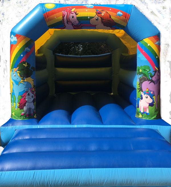 Unicon themed bouncy castle with slide.